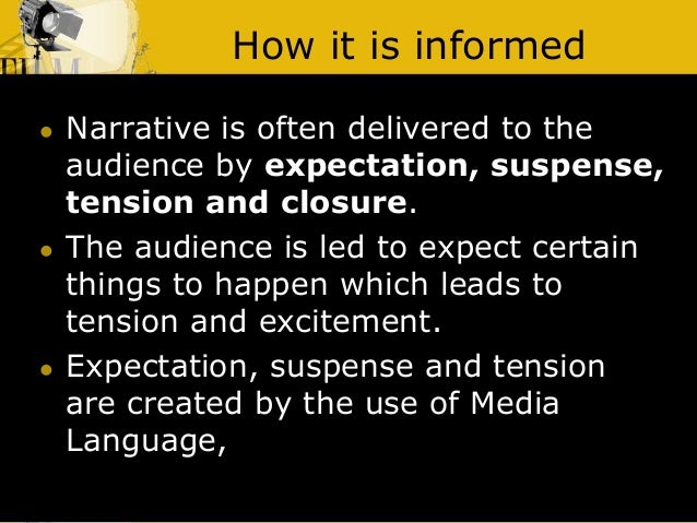 - 10. How it is informed Narrative is often delivered to the audience by expectation, suspense, tension and closure. The audience is led to expect certain things to happen which leads to tension and excitement. Expectation, suspense and tension are created by the use of Media Language,