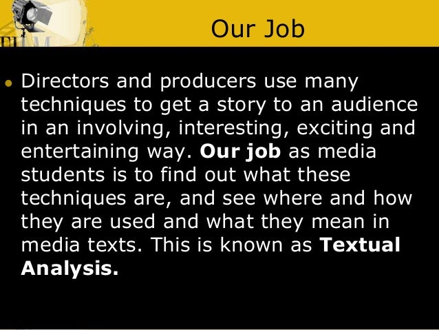 - 11. Our Job Directors and producers use many techniques to get a story to an audience in an involving, interesting, exciting and entertaining way. Our job as media students is to find out what these techniques are, and see where and how they are used and what they mean in media texts. This is known as Textual Analysis.