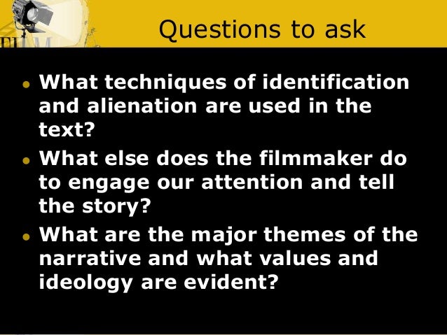 - 13. Questions to ask What techniques of identification and alienation are used in the text? What else does the filmmaker do to engage our attention and tell the story? What are the major themes of the narrative and what values and ideology are evident?