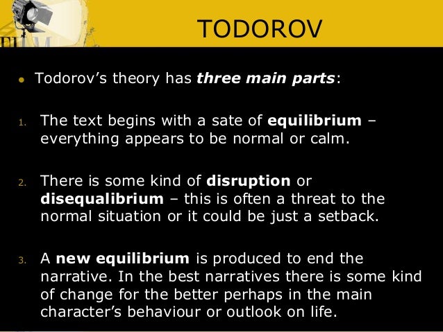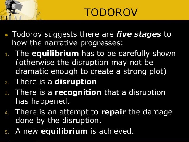 - 17. TODOROV Todorov suggests there are five stages to how the narrative progresses: 1. The equilibrium has to be carefully shown (otherwise the disruption may not be dramatic enough to create a strong plot) 2. There is a disruption 3. There is a recognition that a disruption has happened. 4. There is an attempt to repair the damage done by the disruption. 5. A new equilibrium is achieved.