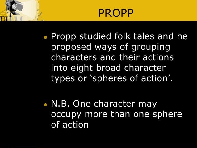 - 19. PROPP Propp studied folk tales and he proposed ways of grouping characters and their actions into eight broad character types or ‘spheres of action’. N.B. One character may occupy more than one sphere of action