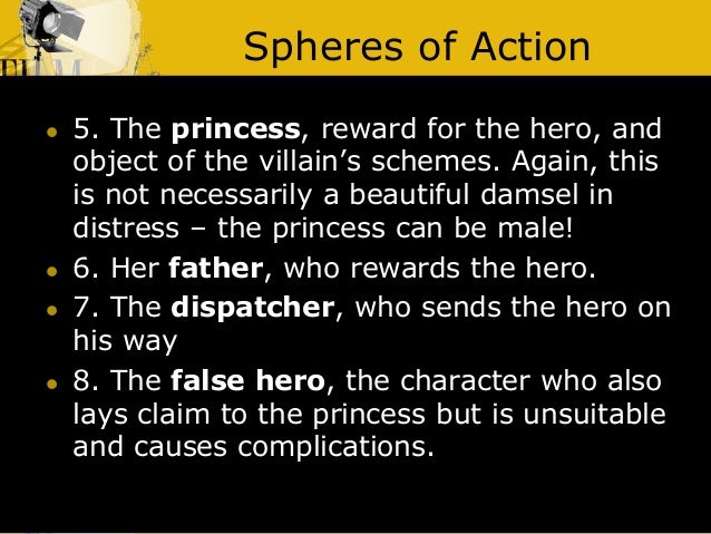 - 21. Spheres of Action 5. The princess, reward for the hero, and object of the villain’s schemes. Again, this is not necessarily a beautiful damsel in distress – the princess can be male! 6. Her father, who rewards the hero. 7. The dispatcher, who sends the hero on his way 8. The false hero, the character who also lays claim to the princess but is unsuitable and causes complications.