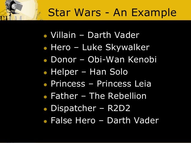 - 23. Star Wars - An Example Villain – Darth Vader Hero – Luke Skywalker Donor – Obi-Wan Kenobi Helper – Han Solo Princess – Princess Leia Father – The Rebellion Dispatcher – R2D2 False Hero – Darth Vader