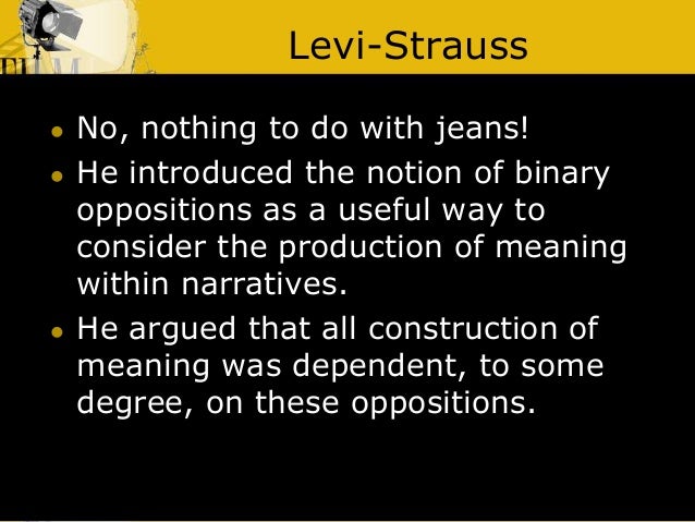 - 24. Levi-Strauss No, nothing to do with jeans! He introduced the notion of binary oppositions as a useful way to consider the production of meaning within narratives. He argued that all construction of meaning was dependent, to some degree, on these oppositions.