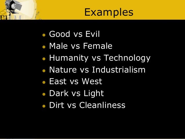 - 25. Examples Good vs Evil Male vs Female Humanity vs Technology Nature vs Industrialism East vs West Dark vs Light Dirt vs Cleanliness