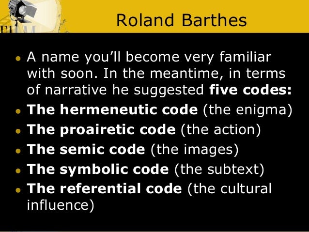 - 26. Roland Barthes A name you’ll become very familiar with soon. In the meantime, in terms of narrative he suggested five codes: The hermeneutic code (the enigma) The proairetic code (the action) The semic code (the images) The symbolic code (the subtext) The referential code (the cultural influence)