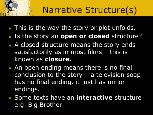 - 4. Narrative Structure(s) This is the way the story or plot unfolds. Is the story an open or closed structure? A closed structure means the story ends satisfactorily as in most films – this is known as closure. An open ending means there is no final conclusion to the story – a television soap has no final ending, it just has minor endings. Some texts have an interactive structure e.g. Big Brother.