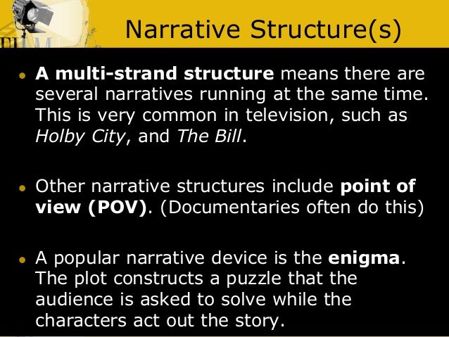 - 5. Narrative Structure(s) A multi-strand structure means there are several narratives running at the same time. This is very common in television, such as Holby City, and The Bill. Other narrative structures include point of view (POV). (Documentaries often do this) A popular narrative device is the enigma. The plot constructs a puzzle that the audience is asked to solve while the characters act out the story.
